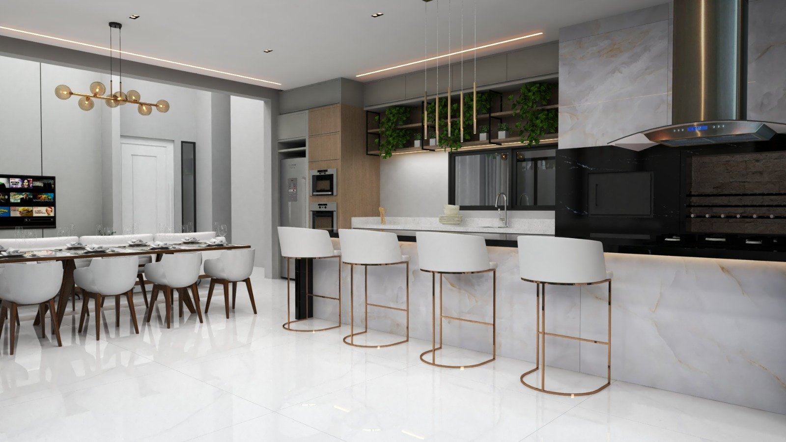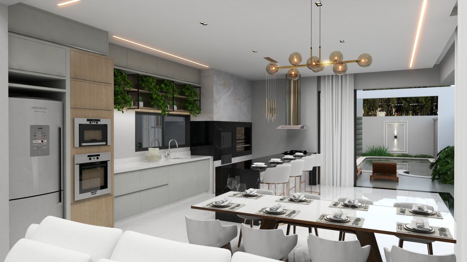 Cozinha integrada com área gourmet, churrasqueira e forno de alto padrão, bancadas em quartzo branco e granito Via Láctea, com vista para a piscina.