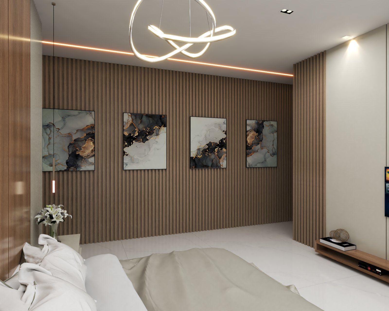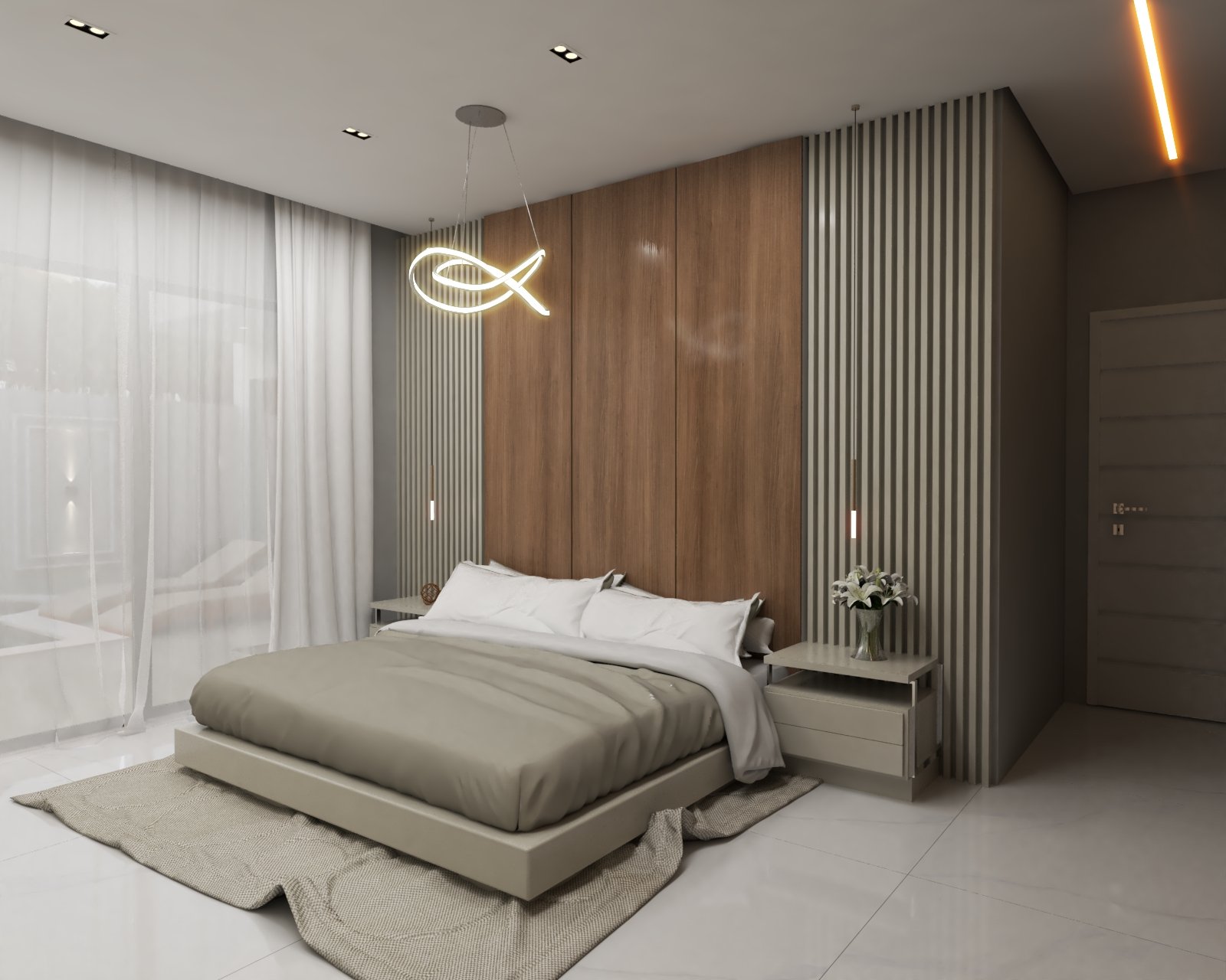 Suíte master com vista para a piscina e cascata, amplo closet personalizável e um banheiro com jardim interno, que proporciona ventilação natural e uma experiência única de banho.